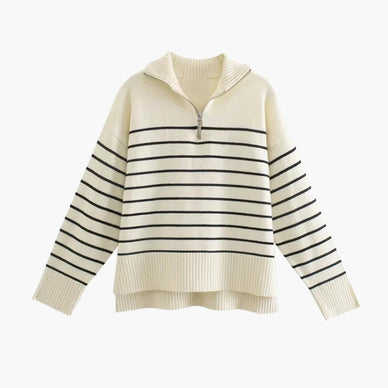 Introducing Old Money Women's Vintage Chic Knit – a timeless sweater with a touch of nostalgia. This cream white and blue striped knit, featuring a stylish zip-up design, captures the essence of the Old Money style. Elevate your wardrobe with this cozy piece, blending classic style with modern comfort, exclusively at Old Money Women