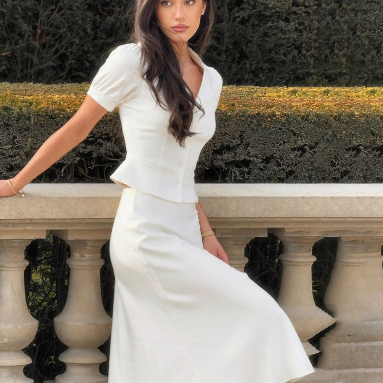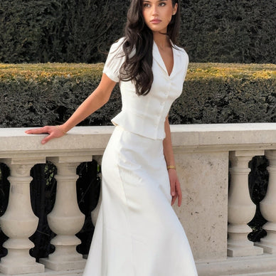 The Pearl Co-ord Set blends soft structure with modern grace, featuring a tailored short-sleeve blouse and a flowy A-line midi skirt — both crafted in a luminous satin-finish fabric that moves with quiet sophistication. Designed to be worn together or styled apart, this two-piece set elevates warm-weather dressing with ease.